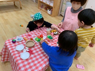 ご家庭での様子をお聞かせいただき、検温・健康状態の確認。一日の支度をすませた後は、自由遊びをして過ごします。
