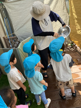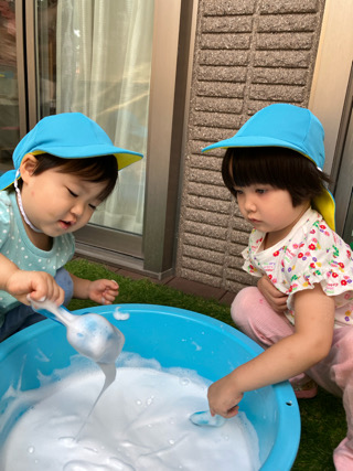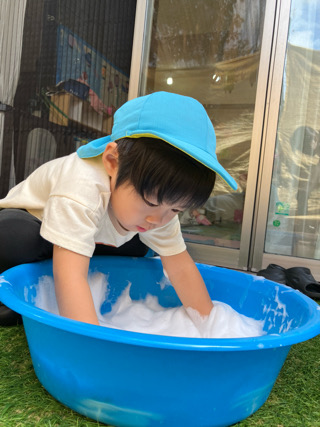 この日は子どもたちの大好きな泡をタライいっぱいに用意し、