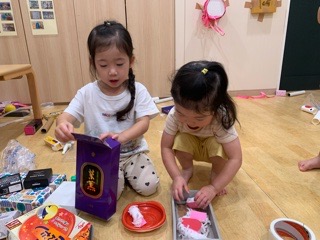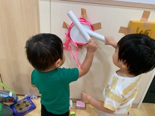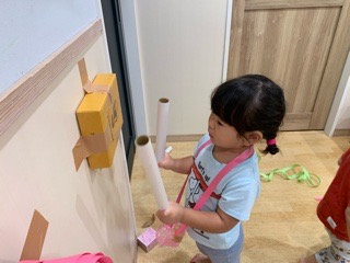 壁に箱を貼ったら太鼓ができるね!と新発見💡