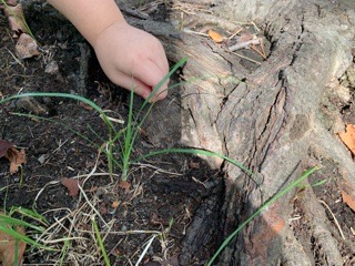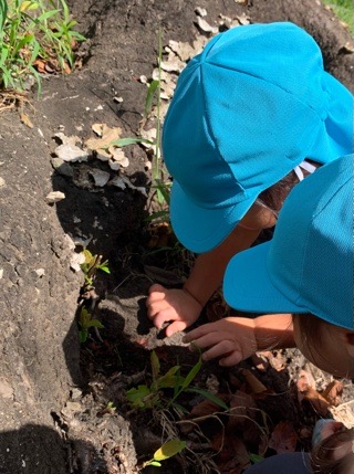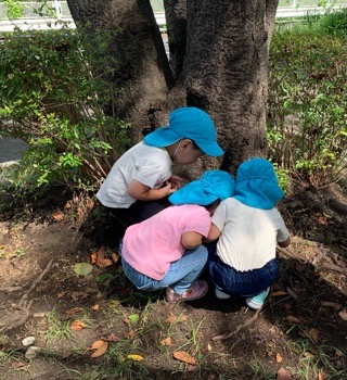 公園に到着すると、以前探していたところへ行き、虫探しを始めたお友だち。
