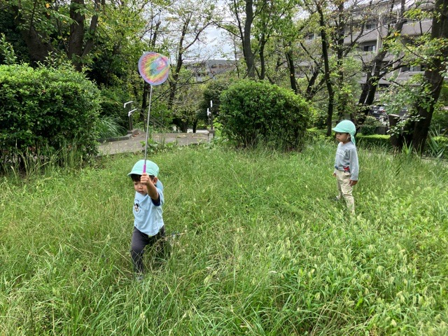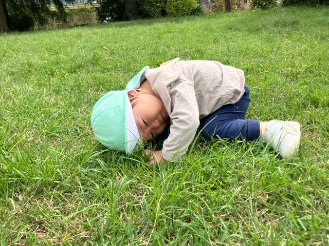 秋になり、バッタが見られるようになりました。手で優しく捕まえられるようになり、嬉しそうな子どもたちです🦗♪