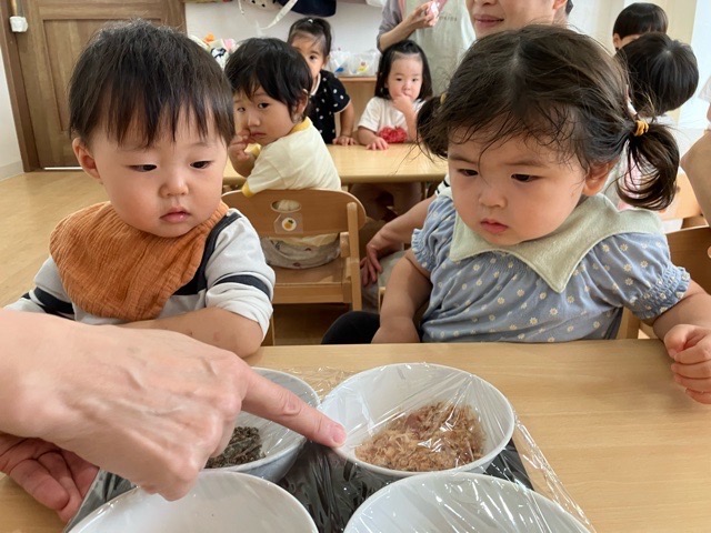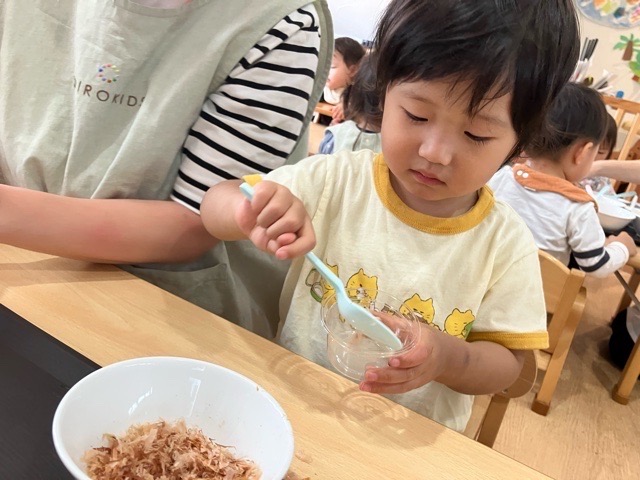 しらす・カツオ節・ゆかり・塩昆布・ごま・刻み海苔、自分で好きなものを選んで、スプーンで掬ってカップに入れます。