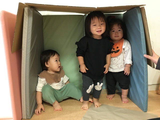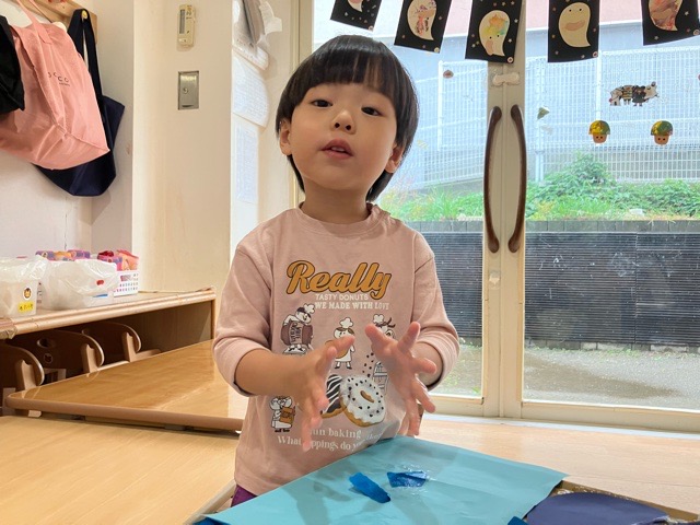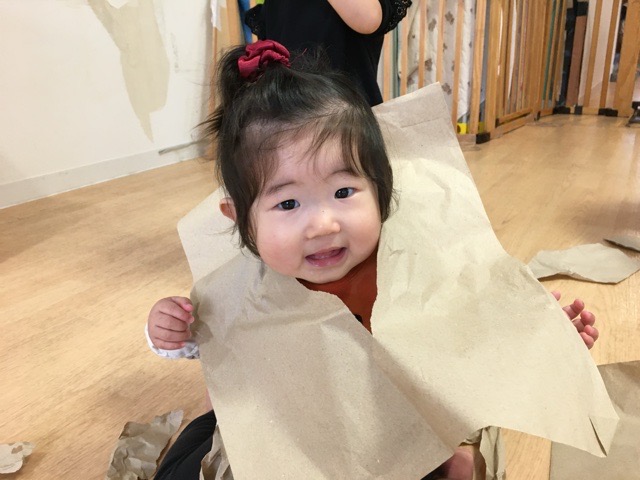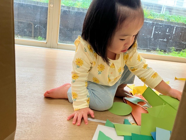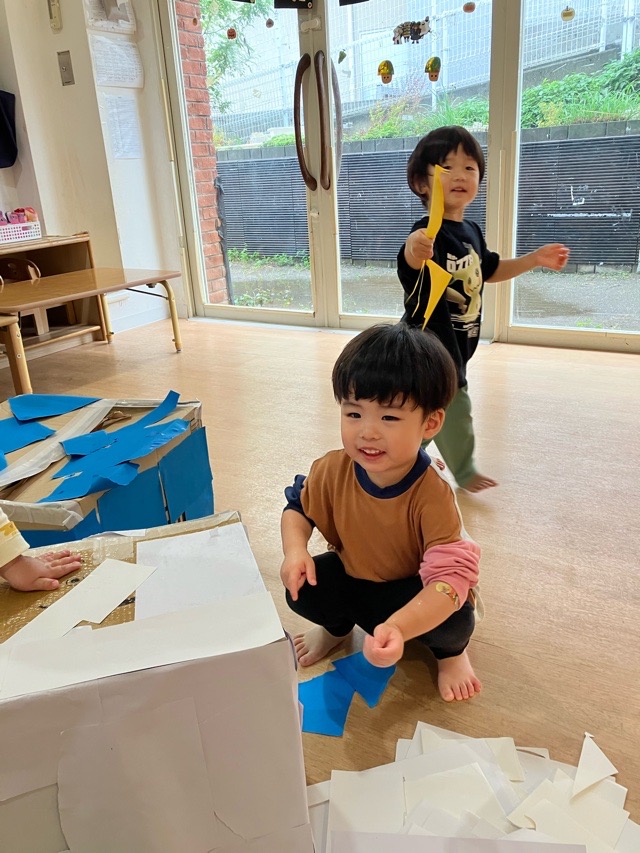 小さいお友だちは、紙をビリビリ切って遊びました!