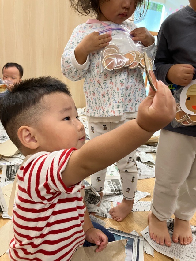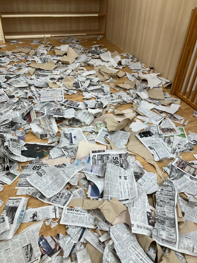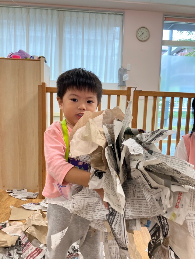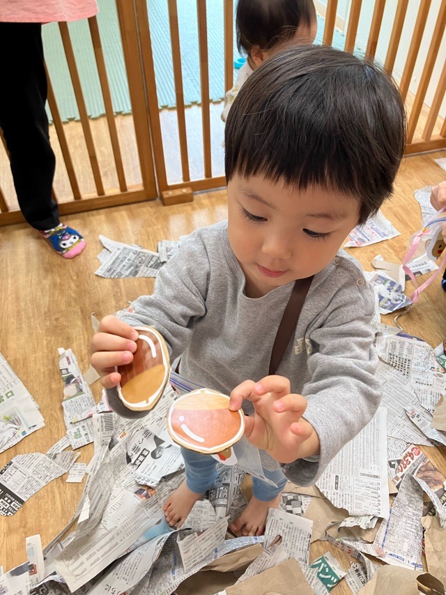 どんぐりたちが全部収穫された後は、新聞紙遊び!