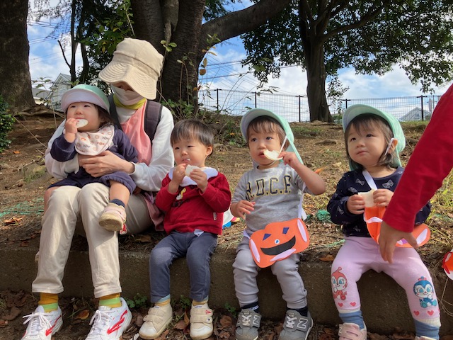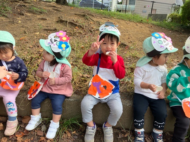 「おせんべい貰ったね〜!」と嬉しそうな子どもたち!青空の下美味しくお菓子を食べました✨