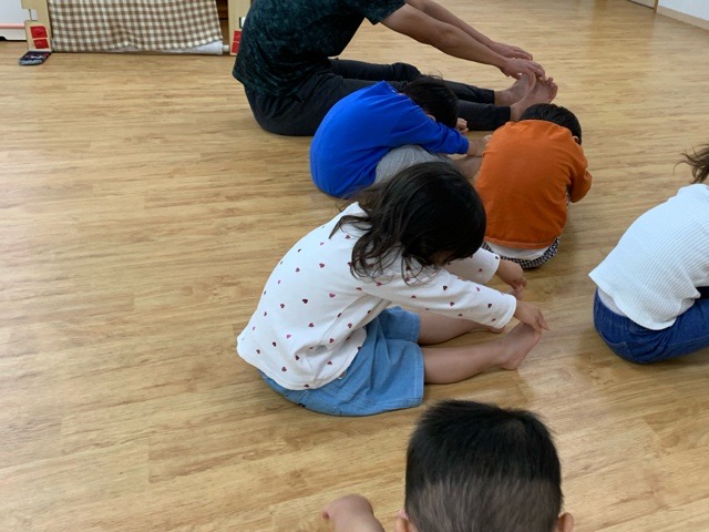 コーチの真似っこをして、準備体操もだんだんと上手になってきた子どもたち☺️