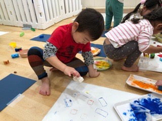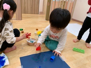 ブロックやカップなどを出すとそちらの方が楽しかったようで、模造紙にペタペタスタンプしていましたよ!
