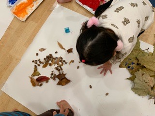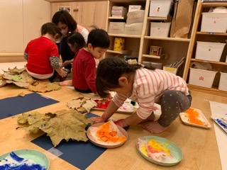 前日に公園や道で拾った、葉っぱやドングリを使ってスタンプ遊びをしました!