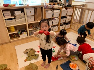 時々葉っぱやドングリにも絵の具をつけて、楽しくスタンプ遊びができました!