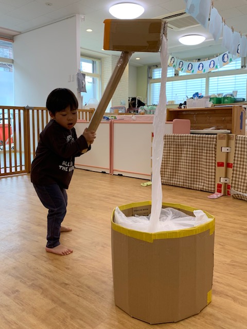みんなでお正月のご挨拶をした後は、お餅つきごっこをしましたよ。