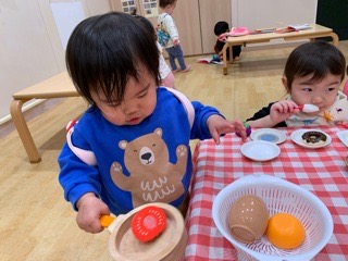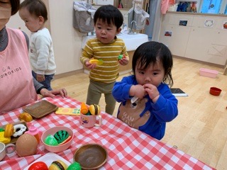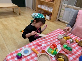 バンダナをスタイに見立ててつけて、しっかり赤ちゃん👶気分です。「食べさせて〜」笑。