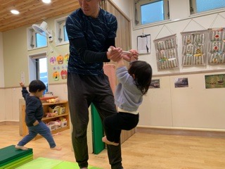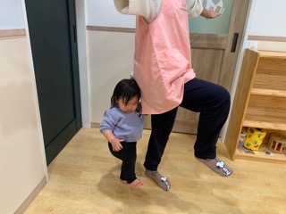 片足立ちはフラフラしちゃうから、先生につかまって…!