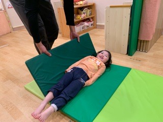 まずはマットに寝転んで、海苔巻きみたいにコロコロ〜!