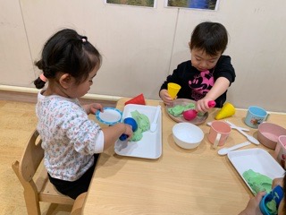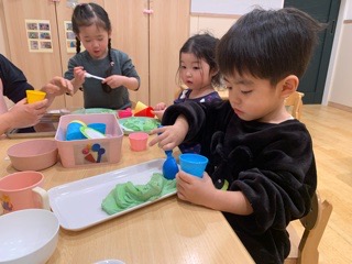 次の日は、全部のスライムを混ぜ合わせていい感じの硬さになったので、アイスクリームやお皿などを用いてごっこ遊びに!