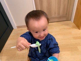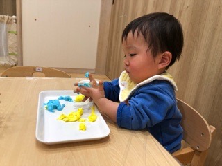 こねこねしていると、色が手について「手についたよ〜」と、手を見せてくれる子も!笑