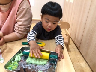 手にあまりつかないタイプのスライムでしたが、色によっては手についたようで小さいお友だちは、手についたものを取ったりちぎったりしていました。
