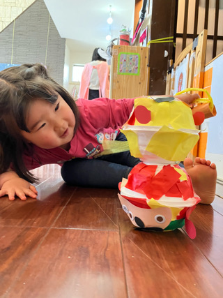 おりがみを思い思いに貼り付けて、可愛いだるまさんのできあがり🥰