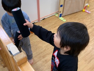 鬼の嫌いな「やいかがし」そして「恵方巻き」がお部屋のどこかに隠れている!というので、2歳児さんに探しに行ってもらいました。