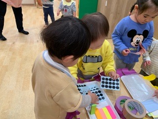 おなじみの丸シールやマスキングテープに、見慣れないポストイットやプチプチなど…様々な素材にみんな興味津々!