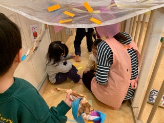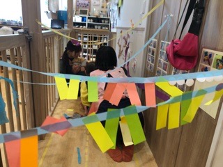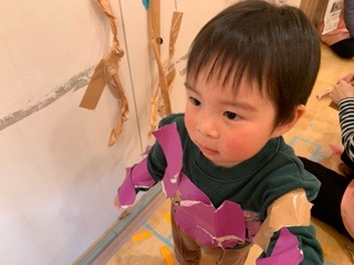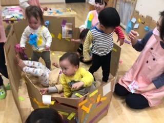 飾り付けたダンボールは丸くしたらおうちになったよ🏠ドアを作って、「おかえりー!」「ただいまー!」のやりとりが聞こえてきます👂✨
