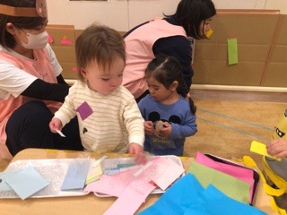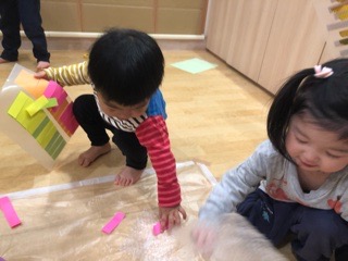 壁や床にぺたぺたぺた、自分の体にも、お友だちや先生にもぺたぺた。もちろん、どこに貼ってもオッケー!🙆♀️