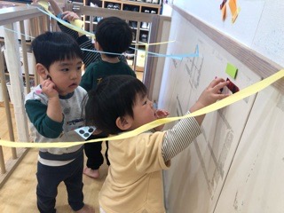 テープを長ーく伸ばすのが楽しい子、丁寧に1つずつ貼っていく子、イメージをもって飾りつけたりオシャレしてみたりする子…