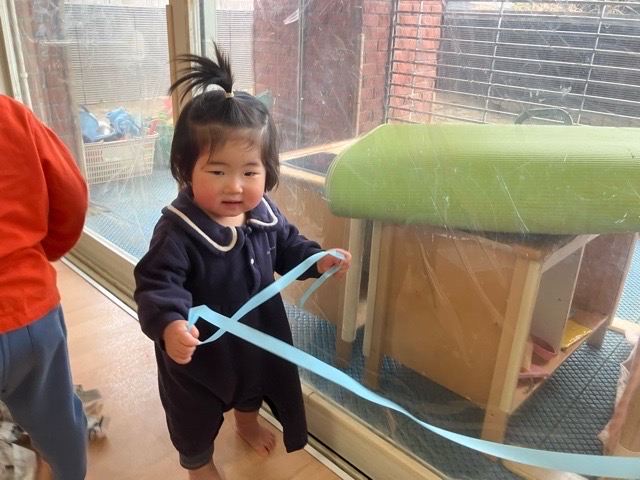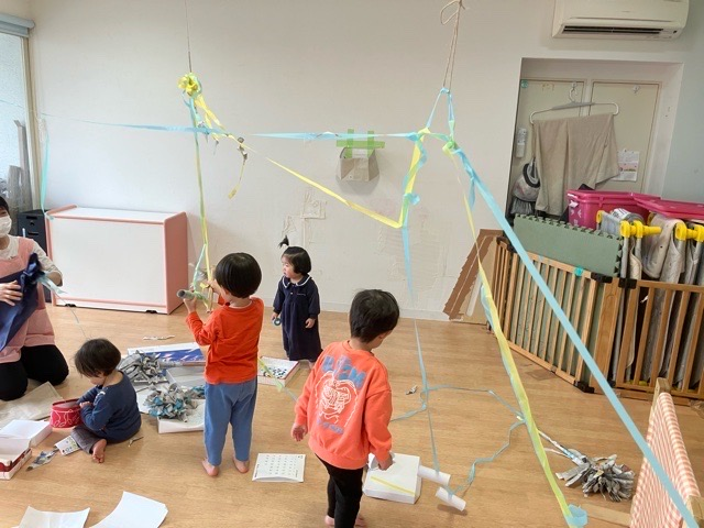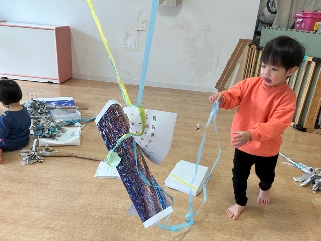 TAMAPLAZA 日々の様子 たまプラーザ園 2026.3.2 廃材あそびをしたよ!🧹🕷️🕸️ 新聞をビリビリー!わーい気持ちー🙌 作ったほうきでせっせとお掃除🧹 「ピカピカになったかなー?」 これ、くっついてくるよー💦 クモの巣になっちゃった👀💦 うわっ!くっついた‼️