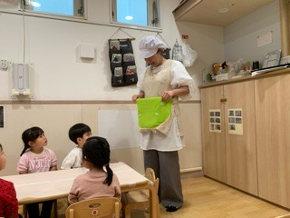 今日はみんなが楽しみにしていたクッキー作り! はじめに調理さんの「不思議なポケット」を見ました!