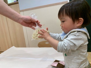 クッキーの材料、「おから」を触らせてくれました。 不思議な感触に、釘付けです。