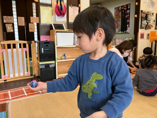 ピザがもーすぐできるよ〜😉 こねたり、ちぎってみたり、絞ってみたり、それぞれがじっくりと夢中で触って楽しみました🥰