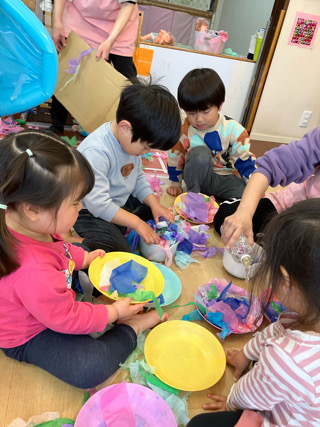 最後は、お皿にお花紙を集めて・・・ どうするの?と子どもたちも興味津々🤩 集めたお花紙に、お水をちょろっといれてみると・・・